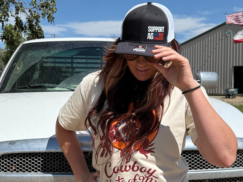 The “Support Ag “ Richardson 112 ball cap is SnapBack with half mesh. Comes in colors All Sage Green, Grey with White Mesh, and Black with white mesh.